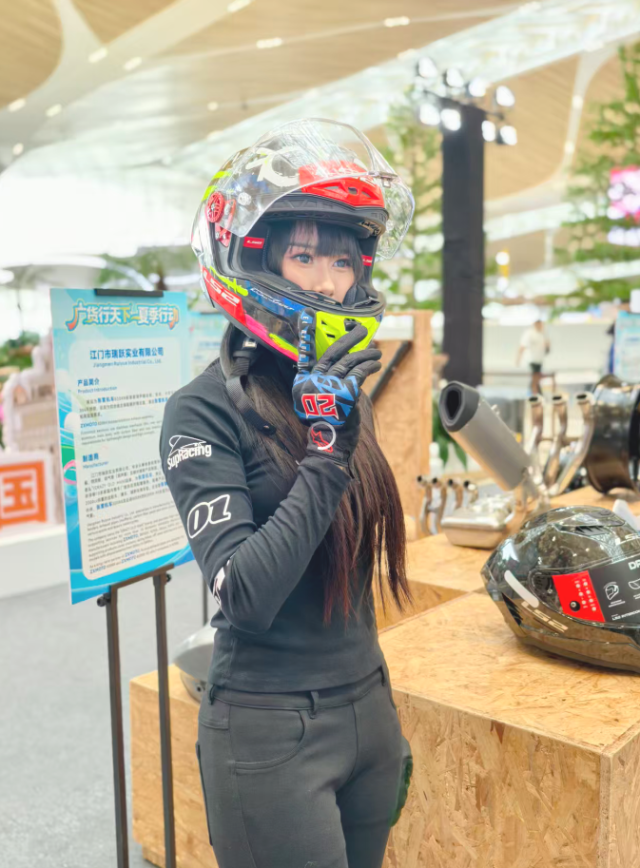 除了整车展示,江门摩托车产业链的实力也在现场得以彰显。江门市鹏程头盔有限公司工作人员郑先生,向驻足旅客和媒体记者详细介绍碳纤维头盔的优势:“赛场上追求极致速度,轻量化的碳纤维头盔能减少风噪,减轻对脖子的压力,帮助骑手更好地把握入弯、出弯时机。”他表示,公司不仅生产赛车头盔,还涉足滑雪等多个需要头部防护的运动领域,凭借过硬品质占据不小市场份额。
