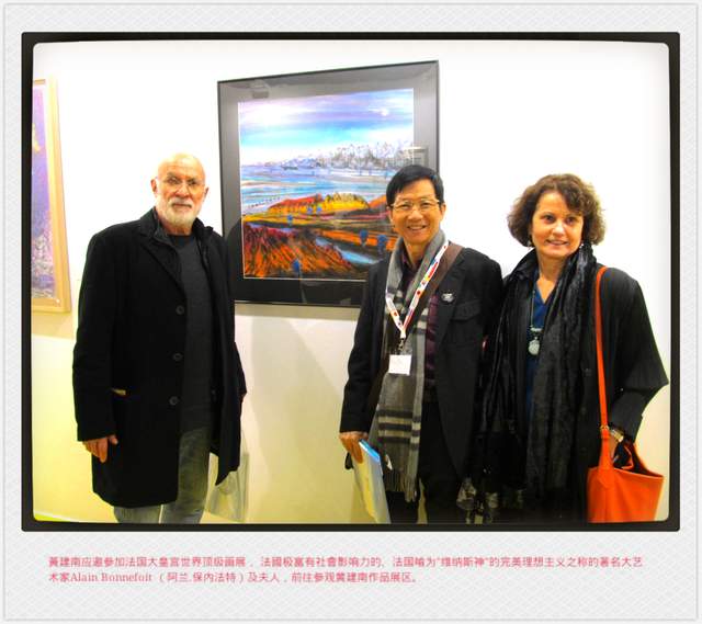 图为黄建南应邀参加法国大皇宫世界顶级画展 ,与著名艺术家Alain Bonnefoit伉俪留影。