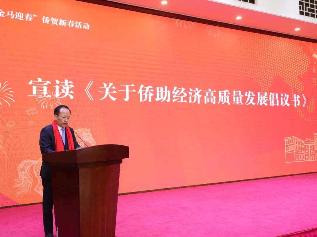 美国美东华人社团联合总会主席梁冠军宣读了《关于侨助经济高质量发展的倡议书》,倡议全球华侨华人在聚焦产业升级中主动作为,助推经济发展量质齐升;在深化科创赋能中勇挑重担,助力产业科技互促双强;在拓展海外市场中架桥铺路,推进深化改革扩大开放;在培育侨界新生中倾心投入,筑牢长远发展坚实基础。